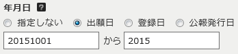 | 3 | 年月日 | 登録日、出願日、公報発行日のいずれかによって、並べ替えの対象となる蓄積画像を絞り込むことができます。 | - |